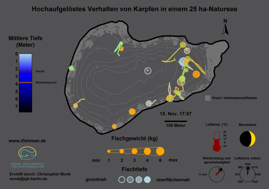Wie verhalten sich Fische in ihrer natürlichen Umgebung? Dieser spannenden Frage sind die Forscher des IFishMan-Teams auf der Grundlage einer weltweit einzigartigen Fischtelemetrieanlage nachgegangen - mit erstaunlichen Ergebnissen. Mit Hilfe unserer akustischen dreidimensionalen Telemetrieanlage (sehen Sie hier für mehr Infos) ist es möglich geworden, das Verhalten von verschiedenen Fischarten (Karpfen, Wels, Schleie, Hecht und Barsch) über einen Zeitraum von über einem Jahr hochauflösend zu beobachten. Das Projekt besteht in der Aufarbeitung der Daten in einer ansprechenden Form für Jedermann, federführend umgesetzt durch den Postdoc Christopher T. Monk und den Arbeitsgruppentutor Philipp Czapla. Im monatlichen Rhythmus erstellen wir verschiedene Videos für jede Fischart einzeln und dann kombiniert als Mehrartenvideo, um Ihnen Einblicke in die Unterwasserwelt zu gewähren. Hier auf unserer Webseite und bei Facebook finden Sie alle Videos der letzten Monate. Viel Spaß beim Stöbern!