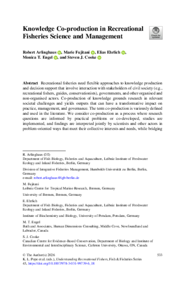 Arlinghaus, R., Fujitani, M., Ehrlich, E., Engel, M. T., & Cooke, S. J. (2026). Knowledge co-production in recreational fisheries science and management. In K. L. Pope, R. Arlinghaus, L. M. Hunt, A. J. Lynch, & B. T. van Poorten (Eds.), Understanding recreational fishers: Disciplinary and interdisciplinary approaches for fisheries management (pp. 533–572). Springer. https://doi.org/10.1007/978-3-031-99739-6_18