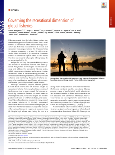 Arlinghaus, R., Abbott, J. K., Fenichel, E. P., Carpenter, S. R., Hunt, L. M., Alós, J., Klefoth, T., Cooke, S. J., Hilborn, R., Jensen, O. P., Wilberg, M. J., Post, J. R., Manfredo, M. J. (2019). Opinion: Governing the recreational dimension of global fisheries. Proceedings of the National Academy of Sciences of the United States of America, 116, 5209-5213