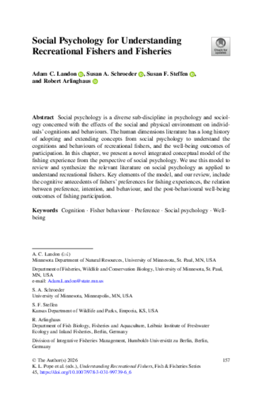 Landon, A. C., Schroeder, S. A., Steffen, S. F., & Arlinghaus, R. (2026). Social psychology for understanding recreational fishers and fisheries. In K. L. Pope, R. Arlinghaus, L. M. Hunt, A. J. Lynch, & B. T. van Poorten (Eds.), Understanding recreational fishers: Disciplinary and interdisciplinary approaches for fisheries management (pp. 157–196). Springer. https://doi.org/10.1007/978-3-031-99739-6_6