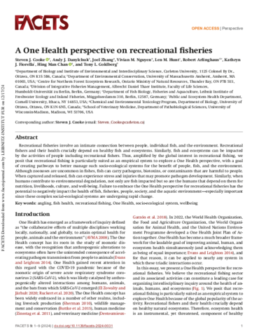 Steven J. Cooke, Andy J. Danylchuk, Joel Zhang, Vivian M. Nguyen, Len M. Hunt, Robert Arlinghaus, Kathryn J. Fiorella, Hing Man Chan, and Tony L. Goldberg. 2024. A One Health perspective on recreational fisheries. FACETS. 9: 1-9. https://doi.org/10.1139/facets-2024-0031