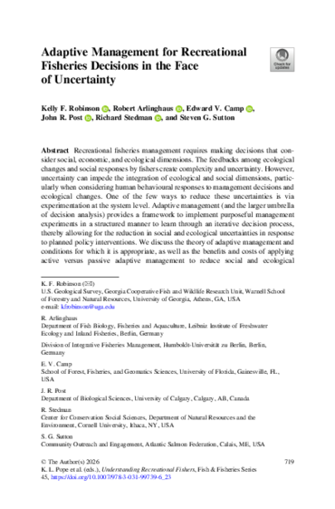 Robinson, K. F., Arlinghaus, R., Camp, E. V., Post, J. R., Stedman, R., & Sutton, S. G. (2026). Adaptive management for recreational fisheries decisions in the face of uncertainty. In K. L. Pope, R. Arlinghaus, L. M. Hunt, A. J. Lynch, & B. T. van Poorten (Eds.), Understanding recreational fishers: Disciplinary and interdisciplinary approaches for fisheries management (pp. 719–746). Springer. https://doi.org/10.1007/978-3-031-99739-6_23