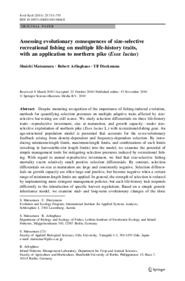 Matsumura, S., Arlinghaus, R., Dieckmann, U. (2011). Assessing evolutionary consequences of size-selective recreational fishing on multiple life-history traits, with an application to northern pike (Esox lucius). Evolutionary Ecology, 25, 711–735