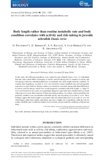 Polverino, G., Bierbach, D., Killen, S., Uusi-Heikkilä, S., Arlinghaus, R. (2016). Body length rather than routine metabolic rate and body condition correlates with activity and risk-taking in juvenile zebrafish Danio rerio. Journal of Fish Biology, 89, 2251–2267