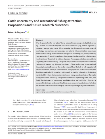Arlinghaus, R. 2024. Catch uncertainty and recreational fishing attraction: Propositions and future research directions. Fish and Fisheries, 00, 1-20.
