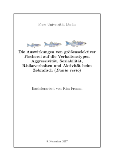 Fromm, K. (2017). Die Auswirkungen von größenselektiver Fischerei auf die Verhaltenstypen Aggressivität, Soziabilität, Risikoverhalten und Aktivität beim Zebrafisch (Danio rerio). Bachelor Thesis, Freie Universität Berlin / Leibniz-Institut für Gewässerökologie und Binnenfischerei (IGB) in Berlin