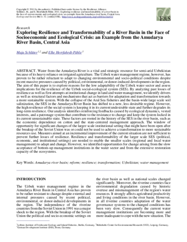 Schlüter, M., Herrfahrdt-Pähle, E. (2011). Exploring resilience and transformability of a river basin in the face of socioeconomic and ecological crisis: an example from the Amudarya River Basin, Central Asia. Ecology and Society, 16(1), 32