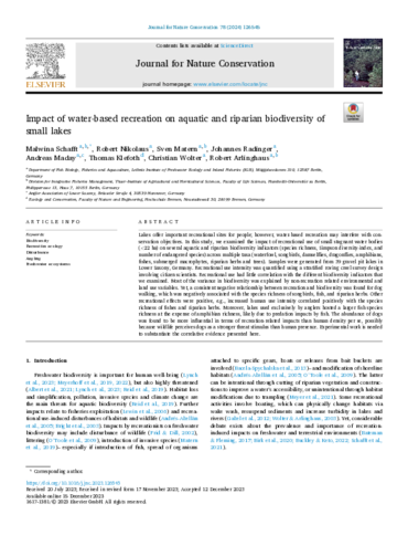 Schafft, M., Nikolaus, R., Matern, S., Radinger, J., Maday, A., Klefoth, T., Wolter, C., Arlinghaus, R. 2024. Impact of water-based recreation on aquatic and riparian biodiversity of small lakes. Journal of Nature Conservation, 78, 126545.
