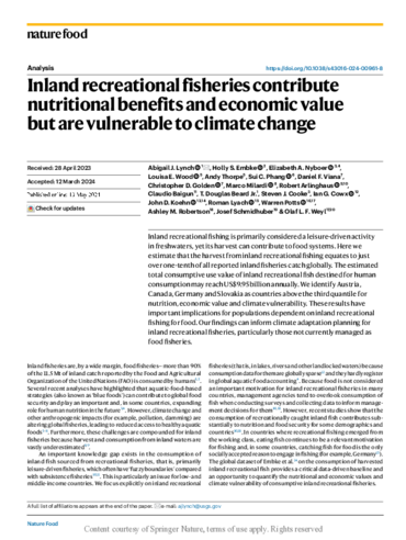 Lynch, A.J., Embke, H.S., Nyboer, E.A., Wood, L.E., Thorpe, A., Phang, S.C., Viana, D.F., Golden, C.D., Milardi, M., Arlinghaus, R., Baigun, C., Beard Jr., D., Cooke, S.J., Cowx, I.G., Koehn, J.D., Lyach, R., Potts, W., Robertson, A.M., Schmidhuber, J., Weyl, O.L.F. Inland recreational fisheries contribute nutritional benefits and economic value but are vulnerable to climate change. Nature Food, 2024.