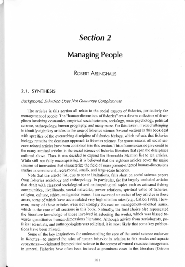 The article in this section all relate to the social aspects of fisheries, particularly the management of people. The "human-dimensions of fisheries" are a diverse collection of disciplines involving economics, empirical social sciences, sociology, socio-psychology, political science, anthropology, human geography, and many more. For this reason, it was challenging to identify eight key articles in this area of fisheries science. Several sections in this book deal with specifics of the overarching discipline of fisheries biology, which reflects that fisheries biologyremains the dominant approach to fisheries science. For space reasons, all social science-related articles have been combined into this section. This of course cannot give credit to the many seminal articles in the social science of fisheries literature that span the disciplines outlined above. Thus, it was decided to expand the Honorable Mention list to ten articles. While still not fully encompassing, it is believed that the eighteen articles cover the major streams of innovation that characterize the field of management-oriented human-dimensions studies in commercial, recreational, small-, and large-scale fisheries.