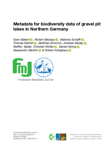 Matern, S., Nikolaus, R., Schafft, M., Klefoth, T., Emmrich, M., Maday, A., Bader, S., Wolter, C., Hering, D., Manfrin, A., Arlinghaus, R. 2023. Metadata for biodiversity data of gravel pit lakes in Northern Germany. Freshwater Metadata Journal, 53, 1-9.
