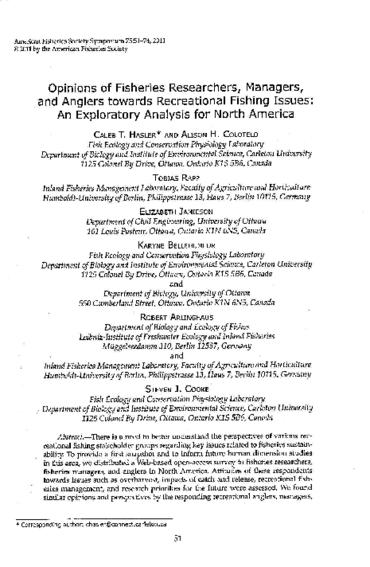 Hasler, C. T., Colotelo, A. H., Rapp, T., Jamieson, E., Bellehumeur, K., Arlinghaus, R., Cooke, S. J. (2011). Opinions of fisheries researchers, managers, and anglers towards recreational fishing issues: an exploratory analysis for North America. American Fisheries Society Symposium, 75, 51-74