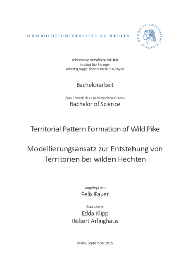 Fauer, F. (2015). Territorial pattern formation of wild pike / Modellierungsansatz zur Entstehung von Territorien bei wilden Hechten. Bachelor Thesis, Humboldt-Universität zu Berlin / Leibniz-Institut für Gewässerökologie und Binnenfischerei (IGB) in Berlin
