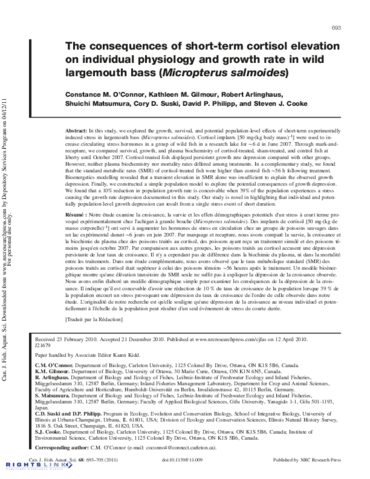 O’Connor, C. M., Gilmour, K. M., Arlinghaus, R., Matsumura, S., Suski, C. D., Philipp, D. P., Cooke, S. J. (2011). The consequences of short-term cortisol elevation on individual physiology and growth rate in wild largemouth bass (Micropterus salmoides). Canadian Journal of Fisheries and Aquatic Sciences, 68, 693-705