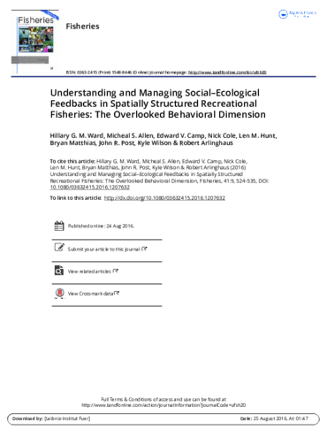 Ward, H. G. M., Allen, M. S., Camp, E. V., Cole, N., Hunt, L. M., Matthias, B., Post, J. R., Wilson, K., Arlinghaus, R. (2016). Understanding and managing social–ecological feedbacks in spatially structured recreational fisheries: the overlooked behavioral dimension, Fisheries, 41, 524-535