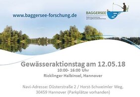 Der BAGGERSEE-Gewässeraktionstag findet am 12. Mai 2018 von 10:00 – 16:00 Uhr in Hannover auf der Halbinsel der Ricklinger Kiesteiche statt. Das Event führt das BAGGERSEE-Team gemeinsam mit dem Fischereiverein Hannover e.V. durch, der ebenfalls als einer der Umsetzungsvereine in das Projekt involviert ist. Die Besucher erwarten viele schöne Aktionen wie Echolot-Bootsfahrten, biologische Gewässeruntersuchungen für Kinder, diverse Angelvorführungen und natürlich jede Menge Infos über BAGGERSEE. Am BAGGERSEE-Infostand gibt es erste kleine Projektfilme zu sehen. Sogar eine Vorführung eines Totholzeintrages wird es geben! Für 11:00 Uhr ist ein kleiner Festakt mit Live Musik geplant, denn BAGGERSEE erhält eine Auszeichnung.